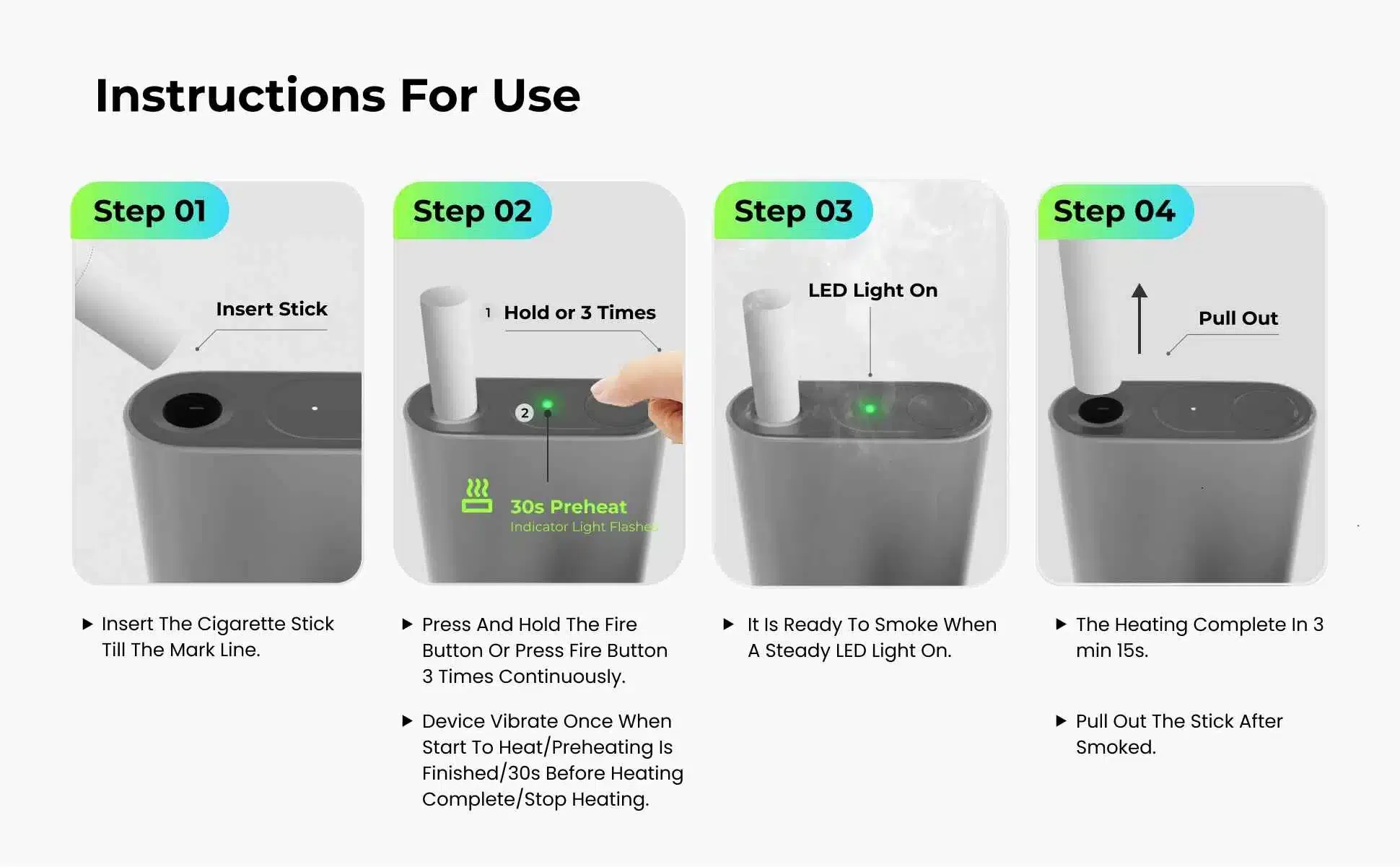 The Bree light can more effectively stimulate the release of stronger tobacco aroma and nicotine by fully heating the cigarettes to active substance. The nicotine release is more sufficient, the smoke volume is greater, and the flavor is richer.The efficient heating technology bring more convenience and joy to tobacco lover and make it to be the must-have item.