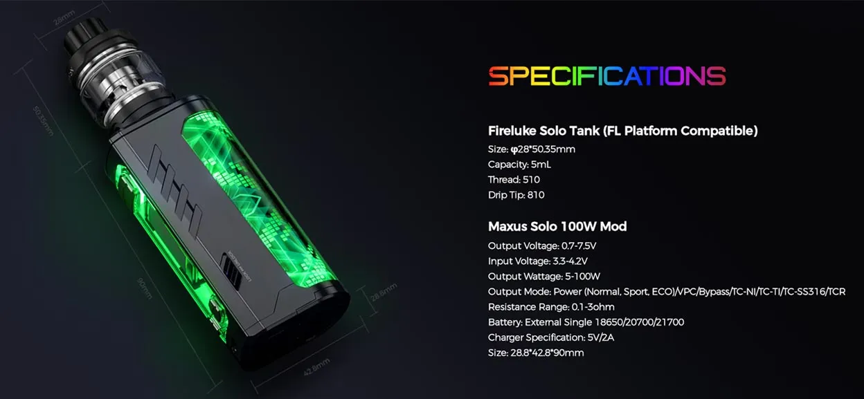 Freemax Maxus Solo 100W Kit consists of Fireluke Solo Tank and Maxus Solo 100W Mod, powered by an external 18650/20700/21700 battery and charged with a 5V/2A USB Type-C cable. It has a cool mood lighting design that will attract lots of attention no matter whether it’s day or night. Besides, this mod also features FMOS 3.0, FM CHIP 3.0, a 1.06-inch OLED screen, multiple output modes, and a slide switch, powerful enough to enhance your vaping experience.